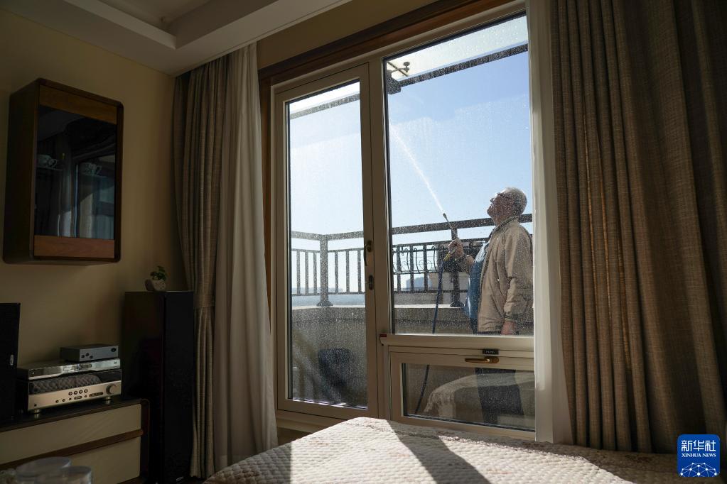 10月12日,在位于河北燕郊的燕达金色年华健康养护中心居家式养老公寓里,吕伟业在阳台上打扫卫生。