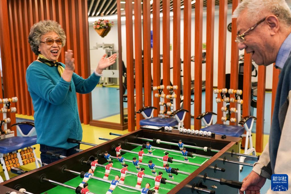 10月12日,在位于河北燕郊的燕达金色年华健康养护中心活动中心内,吕伟业和老伴儿李战平(左)在玩桌面足球。