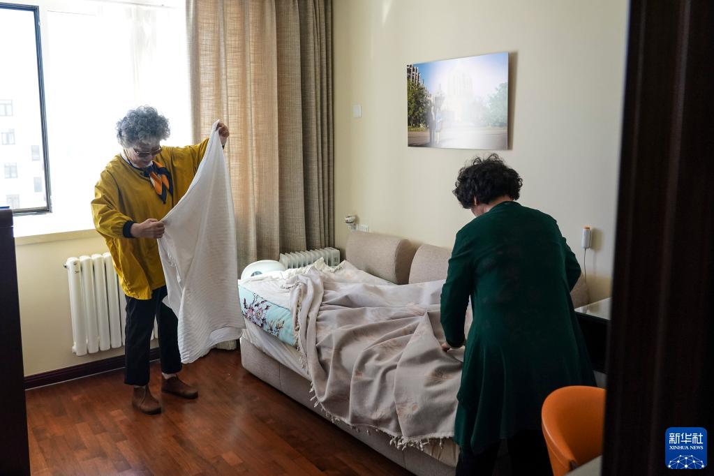 10月11日,在位于河北燕郊的燕达金色年华健康养护中心居家式养老公寓里,李战平(左)和家政阿姨一起收拾房间。
