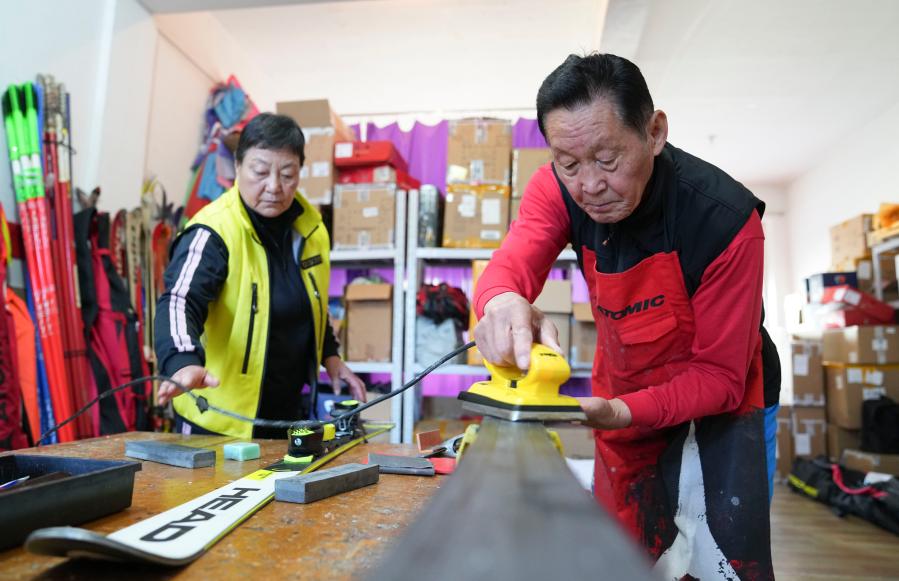 10月12日,朴东锡(右)、张桂珍帮助雪友保养雪板。新华社记者许畅摄