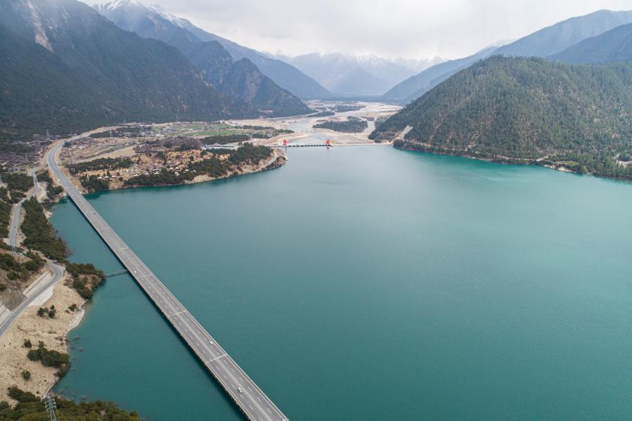 西藏拉林高等级公路沿线风景(2021年4月4日,无人机拍摄)。 新华社记者孙非 摄