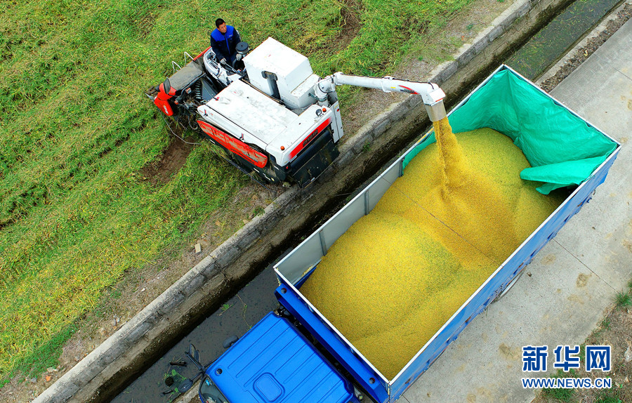 运输车辆在安徽省合肥市庐江县白湖镇现代农业示范基地装运机收的稻谷。新华网发(王闽 摄)