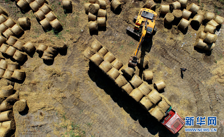 大型运输车在安徽省合肥市庐江县白湖镇现代农业示范基地装运打捆的晚稻秸秆。新华网发(王闽 摄)
