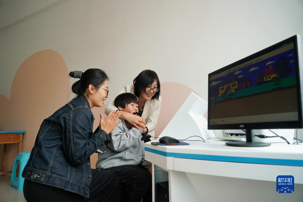 10月13日,张余敏(右)在海兴县特教学校内帮助一名学生练习发音。