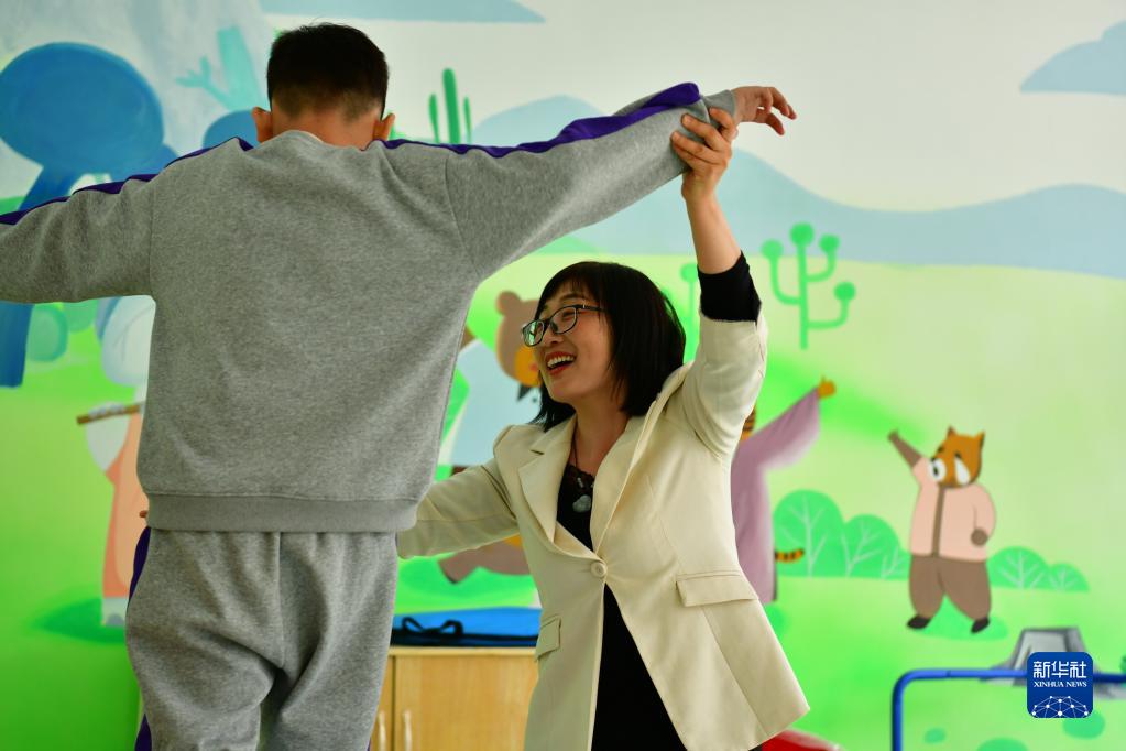 10月13日,张余敏(右)在海兴县特教学校内带领一名学生进行感统训练。