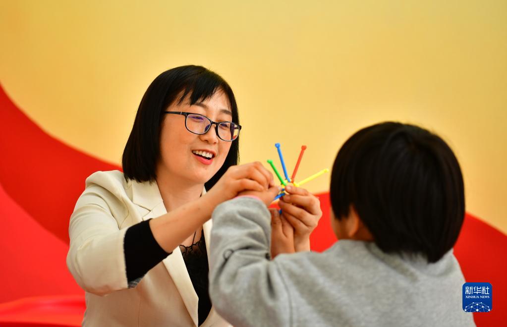 10月13日,张余敏(左)在海兴县特教学校精细动作康复室内和学生做游戏。