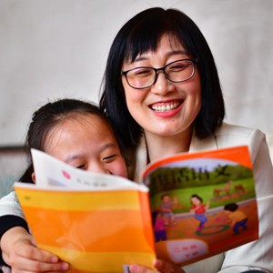 10月13日,在海兴县香坊乡北王村,张余敏(右)在为一名学生读课文。