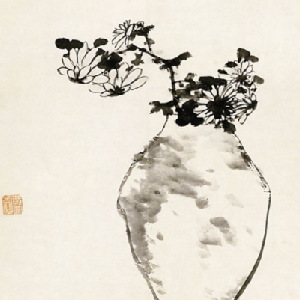 朱耷擅长花鸟、山水、书法,以白眼向天的花鸟闻名于世;但这幅题识为“甲戌年之重阳画”的《瓶菊图》却因其亲切宁静的气息受到世人的钟爱。画中菊花的高低错落、疏密聚散在落笔时就用心经营过了,瓦罐也因柔韧自如的线及透明淹润的点在土气的质感之外又多了一份灵气,画面恬淡、自然。