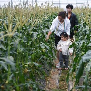 10月16日,在航头镇航川村特色农业精品园的大棚内,游客们在采摘水果玉米。