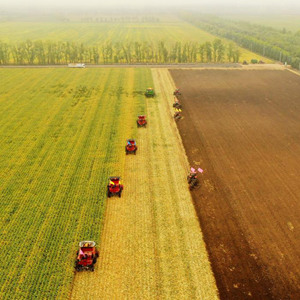东北黑土地,沃野千里,适宜大型机械收获。在黑龙江省黑河市嘉兴现代农机专业合作社大豆田里,多台大型收割机正在抢收。一排排挂满豆荚的大豆茎秆卷入机器,脱粒、秸秆粉碎还田一气呵成。