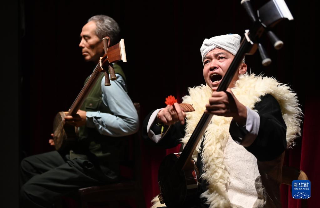 10月16日,陕北说书艺人陈文艺(右)在陕北民歌博物馆为观众表演陕北说书。
