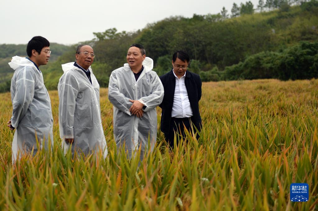 10月17日,测产专家组组长、中国科学院院士谢华安(左二)在测产现场查看水稻生长情况。新华社记者 陈振海 摄