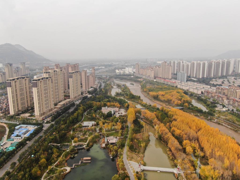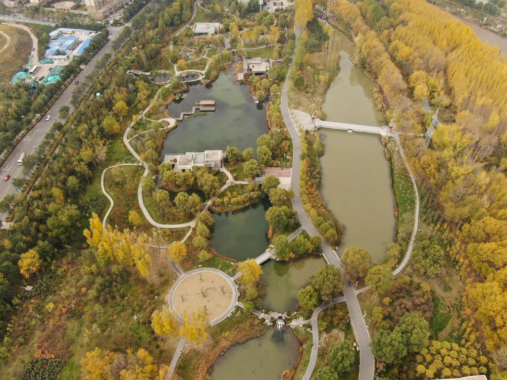 2021年10月16日拍摄的青海西宁湟水国家湿地公园一角(无人机照片)。新华社记者王艳 摄
