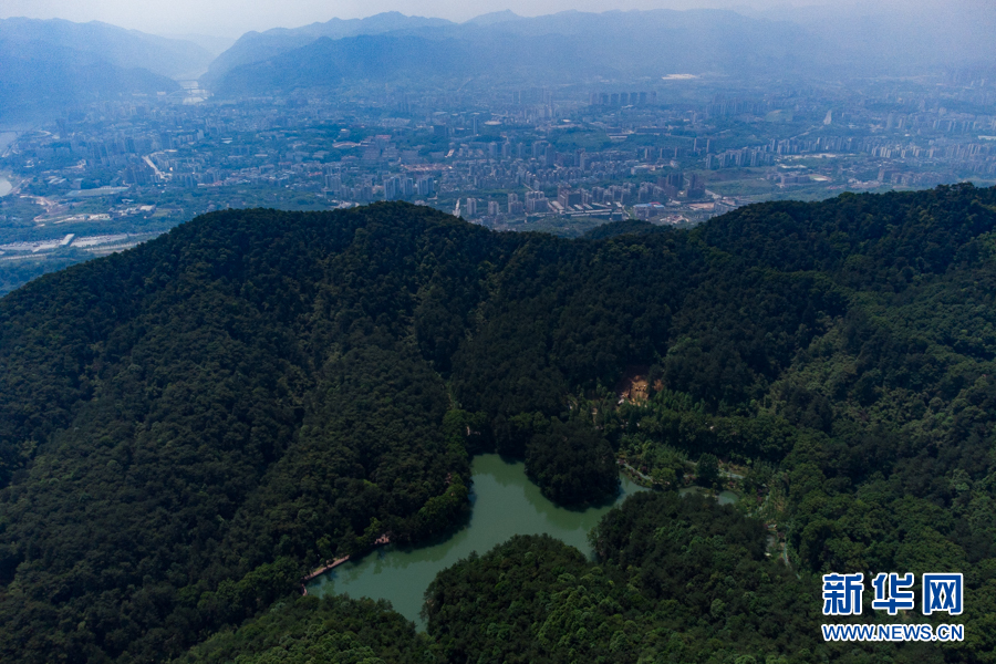 航拍整治修复后的缙云山黛湖景区(拍摄于5月21日)。黛湖有“水生鼓藻植物宝库”之称,生态修复保护了当地的生物多样性。新华网 耿骏宇 摄