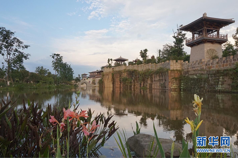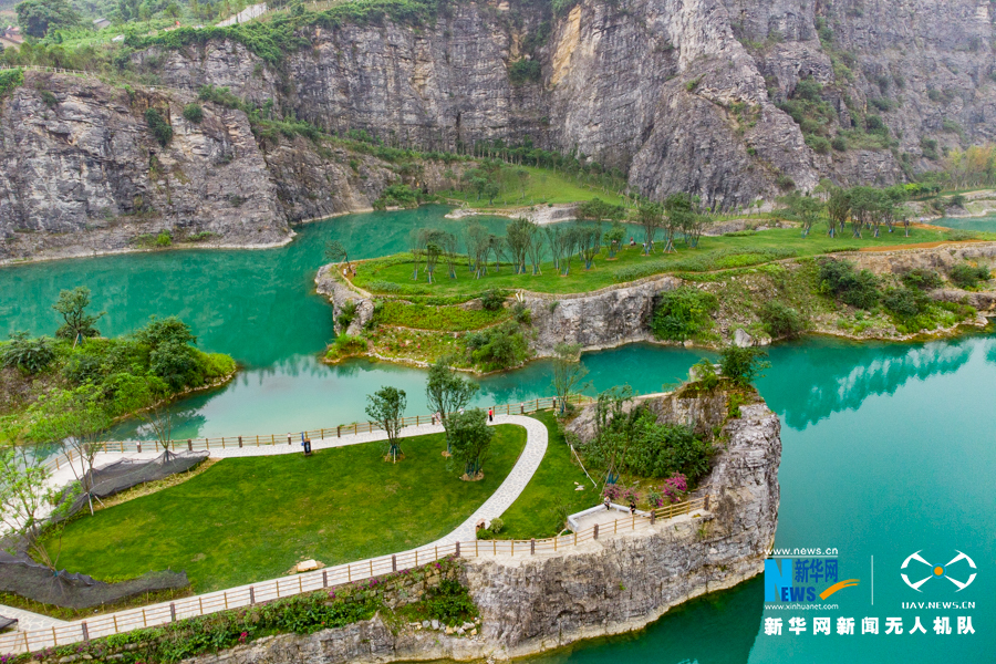 蓝天白云下的荣昌区玉带河矿坑生态文化公园。废弃矿坑变身亲水公园,不仅改善了人居环境,也提升了城市形象。新华网 发