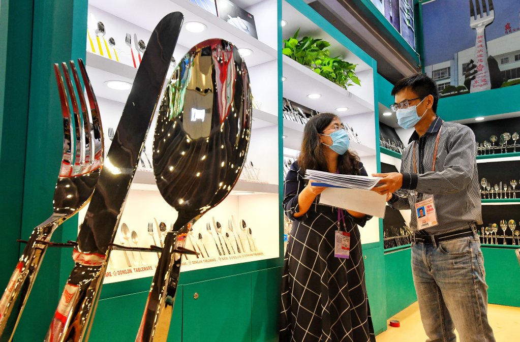 10月15日,一名国内采购商(右)在第130届广交会不锈钢餐具展台洽谈。新华社记者 刘大伟 摄