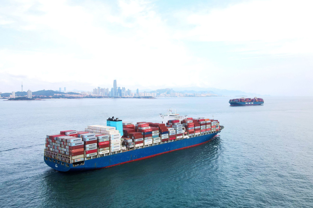 8月7日,在山东青岛胶州湾,集装箱货轮在航道上行驶。新华社发(俞方平 摄)