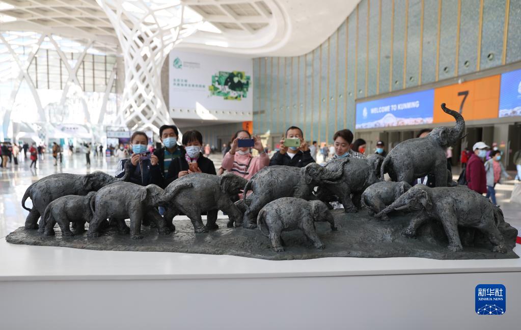 10月18日,市民在昆明滇池国际会展中心内观看COP15主题雕塑《生物的长城脊》。