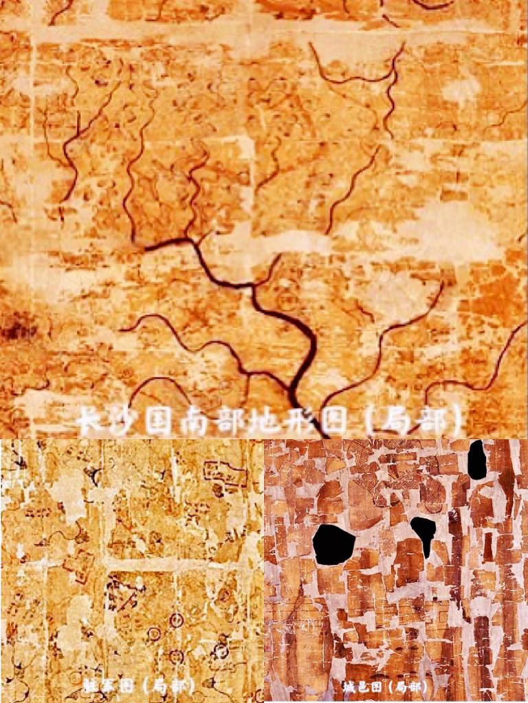 1973年从西汉马王堆三号墓中出土的三幅地图——《驻军图》《长沙国南部地形图》《城邑图》(局部拼图)