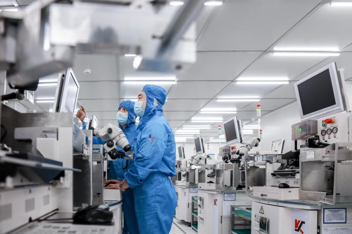 位于新郑市薛店镇的郑州电子信息产业园里,锐杰微科技集团工人在生产线上加紧生产。新郑市委宣传部供图