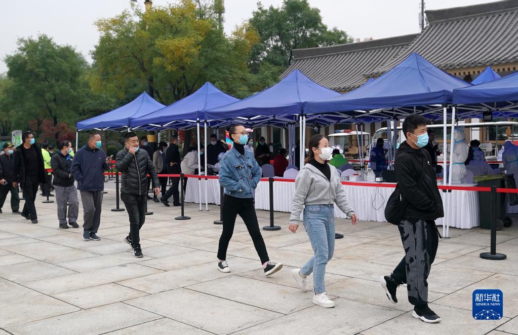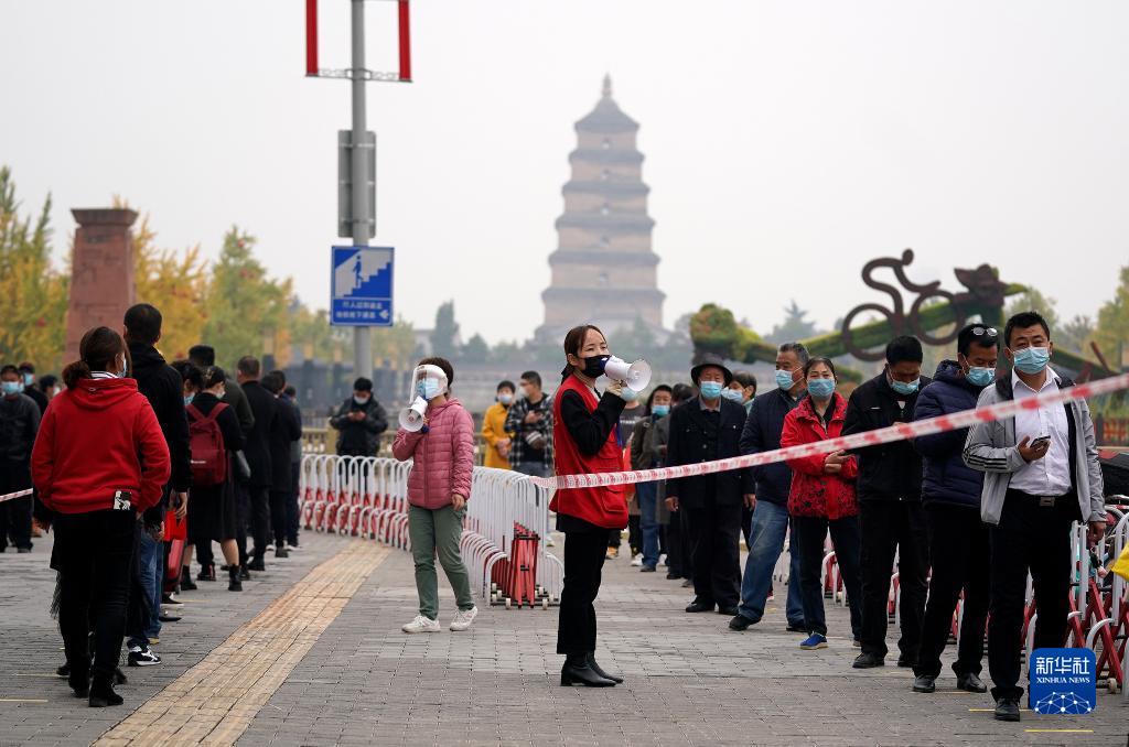 10月19日,市民在西安市曲江池遗址公园外一核酸检测点排队进行核酸检测。新华社记者 刘潇 摄