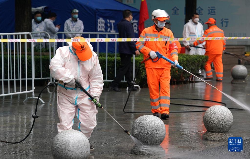 10月19日,确诊病例轨迹涉及到的西安市曲江南苑小区外,工作人员进行清洗消杀。新华社记者 刘潇 摄