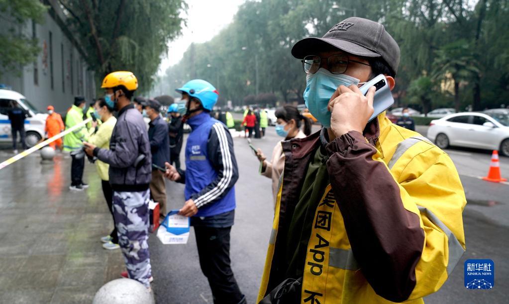 10月19日,确诊病例轨迹涉及到的西安市曲江南苑小区实施封闭管理,外卖配送员在小区外等待工作人员帮助小区业主取餐。新华社记者 刘潇 摄