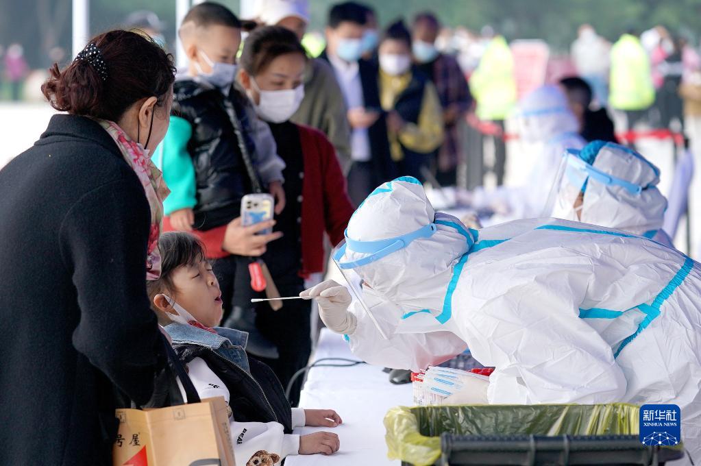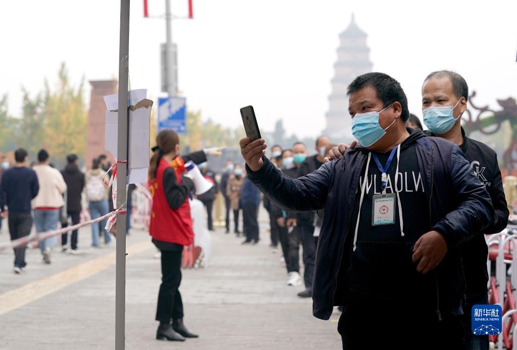 10月19日,市民在西安市曲江池遗址公园外一核酸检测点进行核酸检测。新华社记者 刘潇 摄