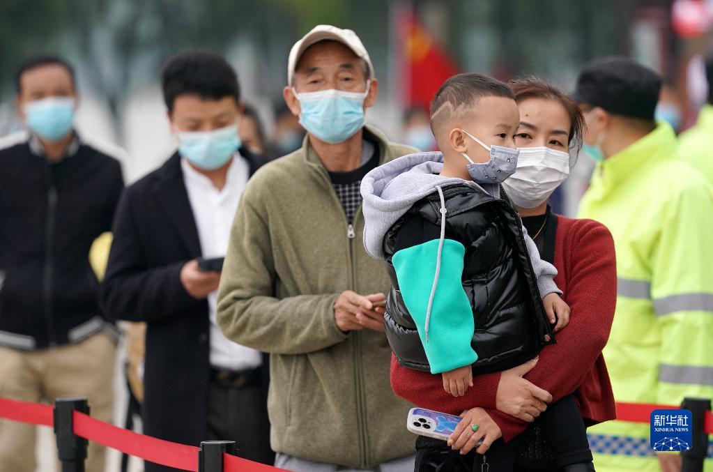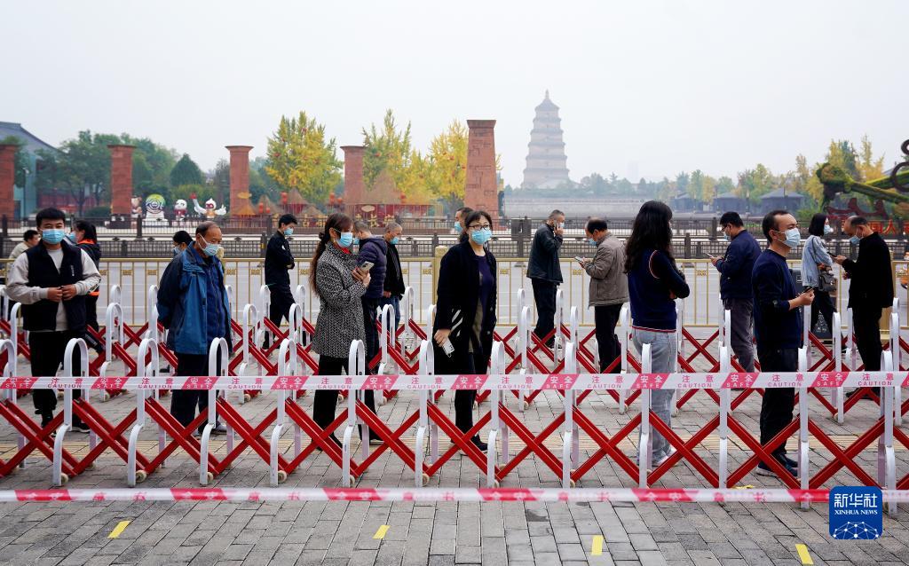 10月19日,市民在西安市曲江池遗址公园外一核酸检测点排队进行核酸检测。新华社记者 刘潇 摄