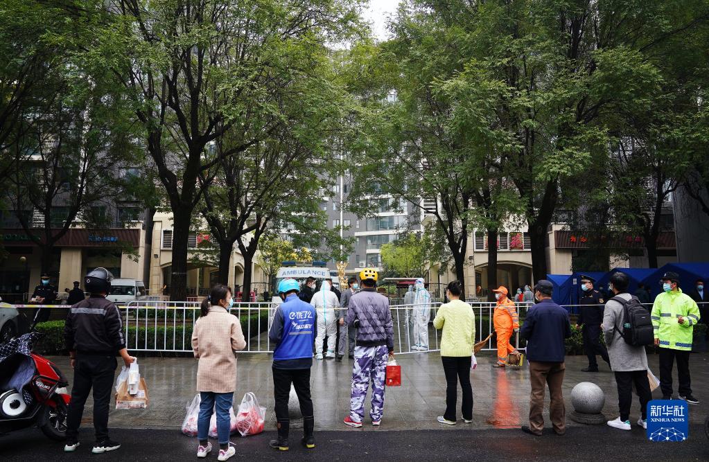10月19日,确诊病例轨迹涉及到的西安市曲江南苑小区实施封闭管理,外卖配送员及业主亲友在小区外等待工作人员帮助小区业主领取物品。新华社记者 刘潇 摄