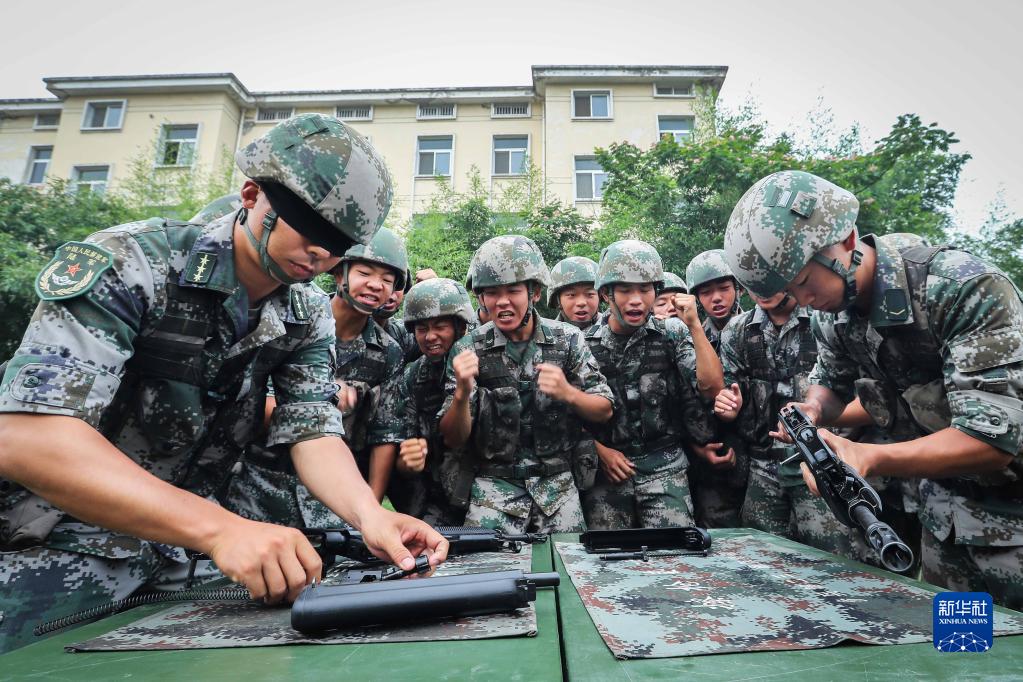 孙金龙(前左)和战士进行枪支分解结合竞赛(6月26日摄)。新华社发(王磊 摄)