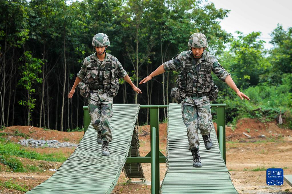 孙金龙(右)与战士一起进行课目训练(6月9日摄)。新华社发(王磊 摄)