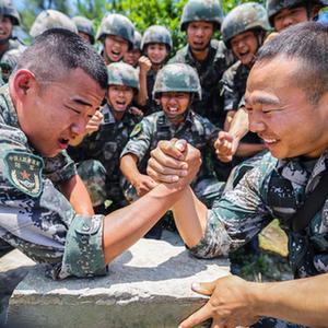 训练间隙,孙金龙(前右)与连队战士掰手腕(6月4日摄)。新华社发(王磊 摄)