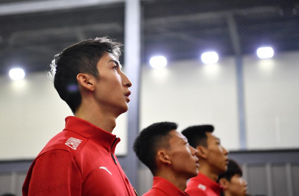 武大靖(前)和队友在出征仪式上唱国歌(10月16日摄)。新华社记者 宋彦桦 摄