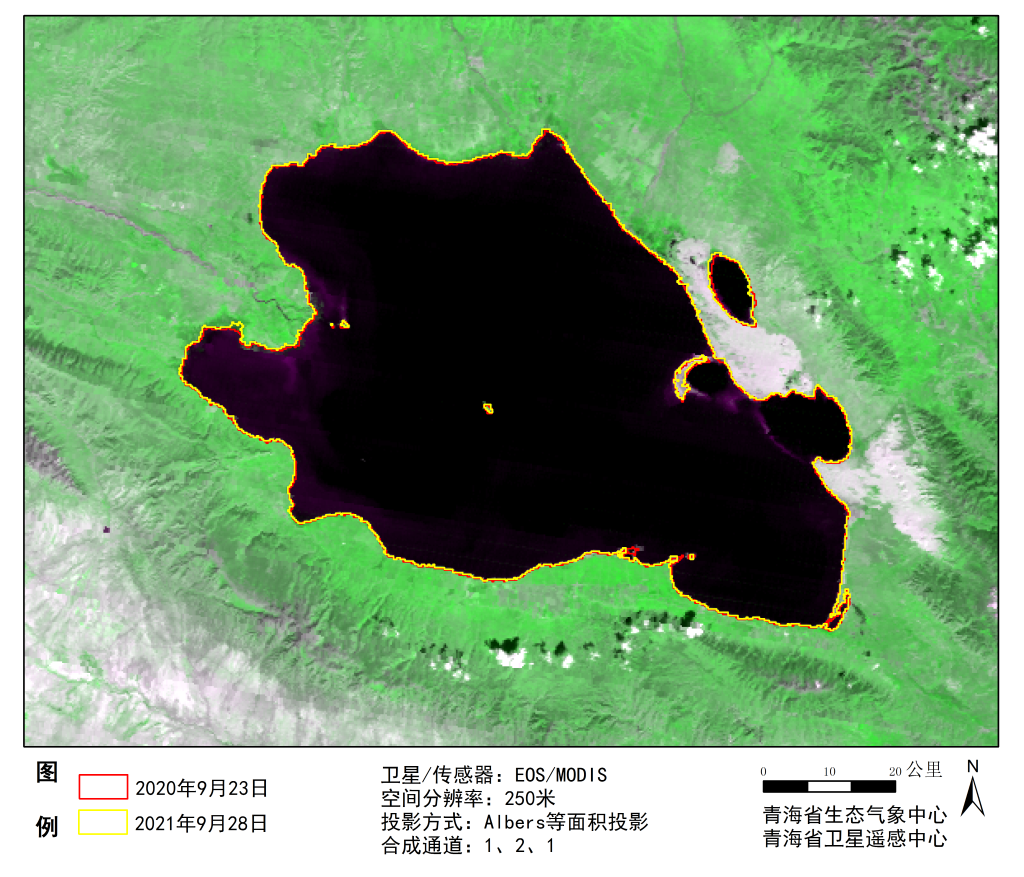 这是2021年9月28日卫星遥感监测到的青海湖水体面积图。(青海省气象科学研究所供图)