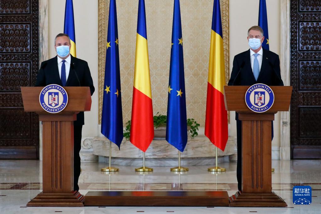 10月21日,罗马尼亚总统约翰尼斯(右)和看守政府国防部长尼古拉·丘克共同出席记者会。新华社发(克里斯泰尔摄)