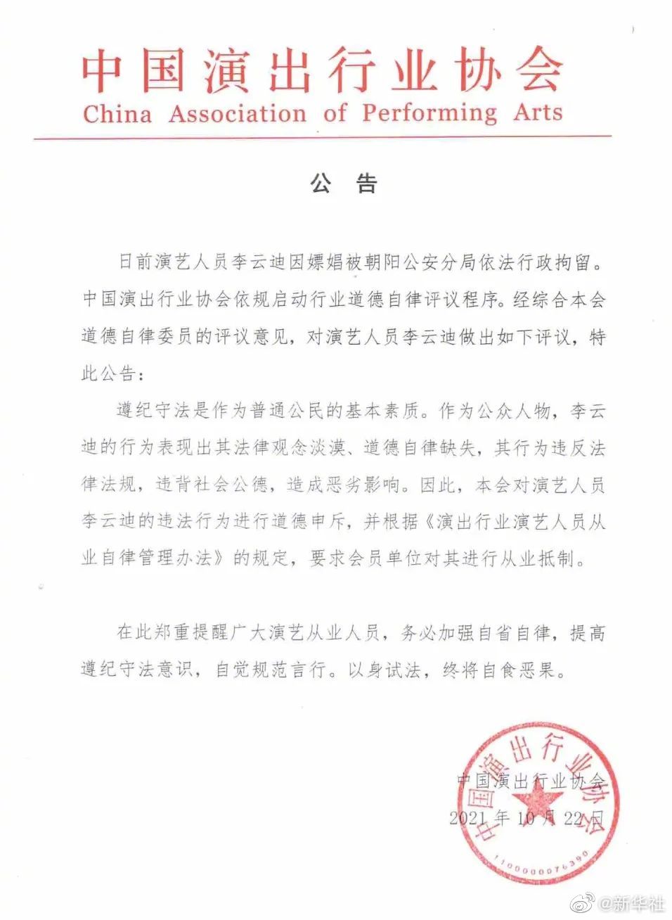 中国演出行业协会22日发布公告:作为公众人物,李云迪的行为表现出其法律观念淡漠、道德自律缺失,其行为违反法律法规,违背社会公德,造成恶劣影响。因此,本会对演艺人员李云迪的违法行为进行道德申斥,并根据《演出行业演艺人员从业自律管理办法》的规定,要求会员单位对其进行从业抵制。在此郑重提醒广大演艺从业人员,务必加强自省自律,提高遵纪守法意识,自觉规范言行。以身试法,终将自食恶果。(记者王鹏)