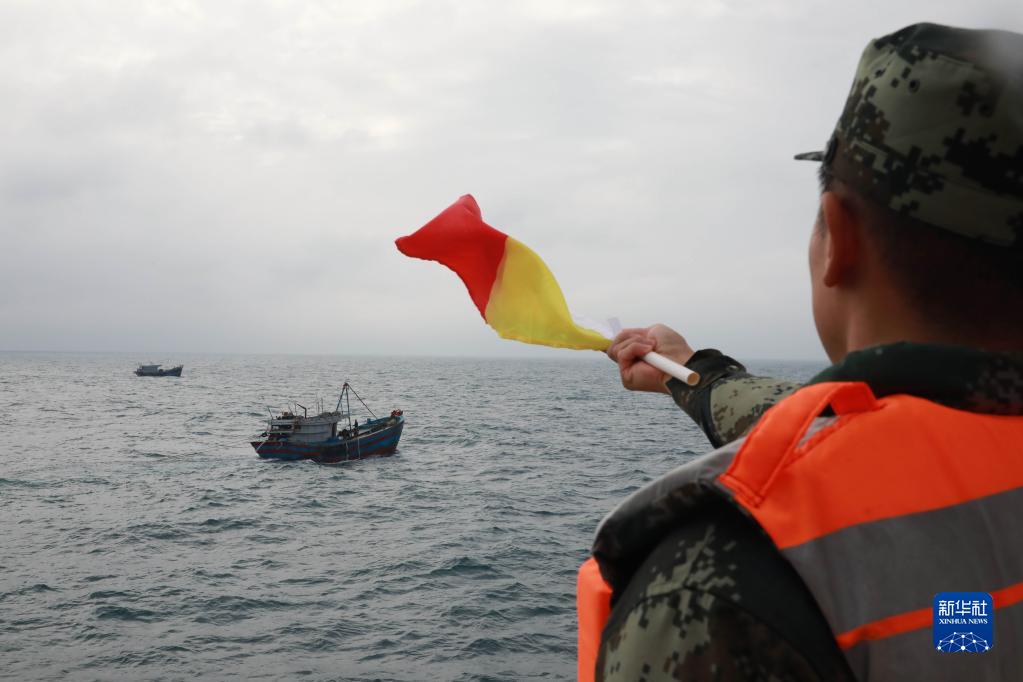 中国海警执法员运用旗语对在北部湾海域非法捕捞的越南渔船进行驱离(10月19日摄)。新华社发(郑建清 摄)