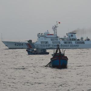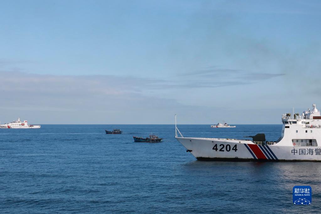 中、越海警舰艇在北部湾海域对非法捕捞的越南渔船进行驱离(10月20日摄)。新华社发(郑建清 摄)