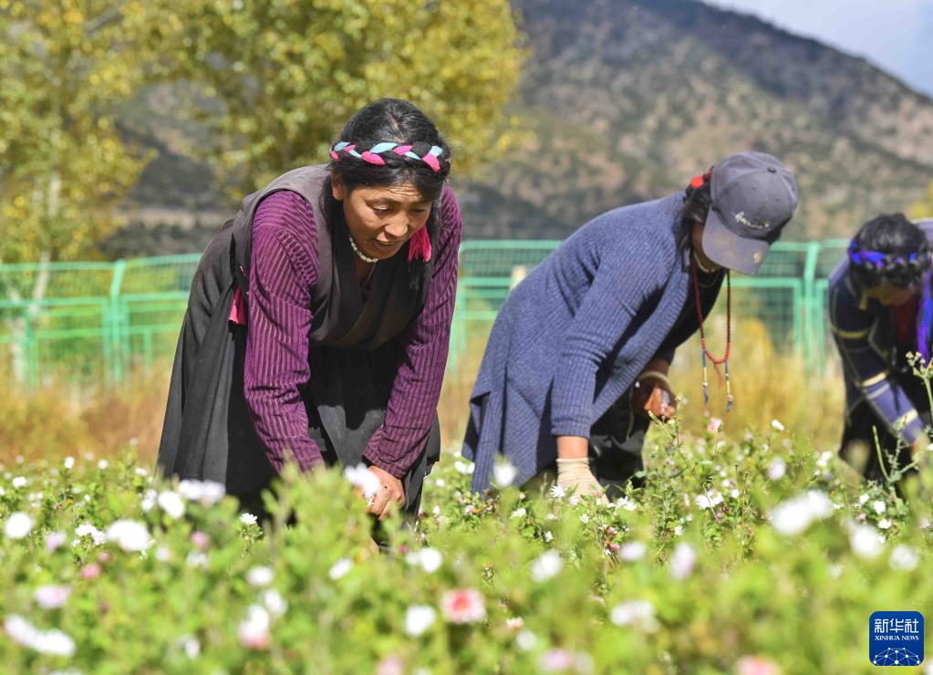 10月22日,郎达村村民在得荣县药材种植示范基地内收获药菊。