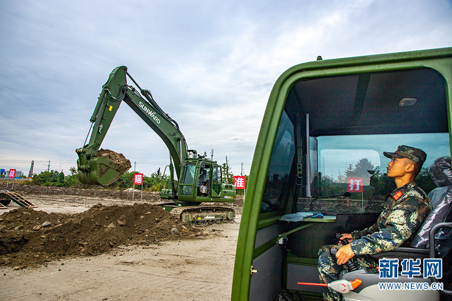 参赛官兵在驾驶舱内远程控制挖掘机(摄于10月20日)。新华网发(武警第二机动总队某支队供图)