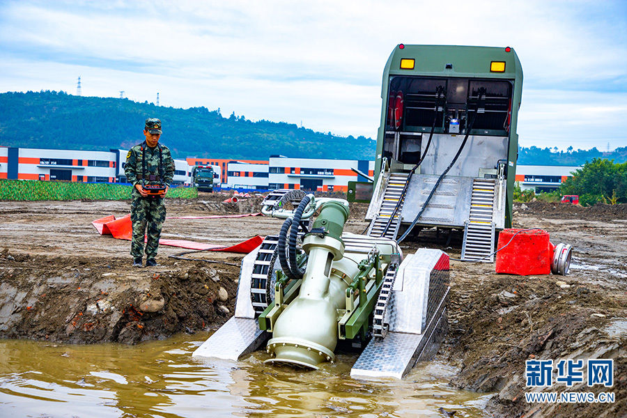 远程控制子母排水抢险车(摄于10月20日)。新华网发(武警第二机动总队某支队供图)
