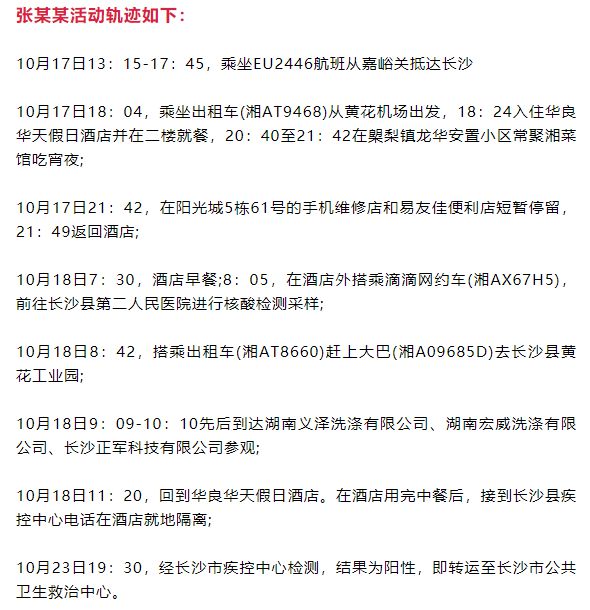 阳性检测者1:张某某,为甘肃省嘉峪关人,来长沙参加由江苏某企业举办的智能洗涤观摩活动。系长沙县前期通报确诊病例蒋某某同行外省来长沙人员。10月18日晚已由长沙县定点集中隔离管理,18-22日连续5天每日核酸检测结果均为阴性。23日检出阳性,现已转运至长沙市公共卫生救治中心。