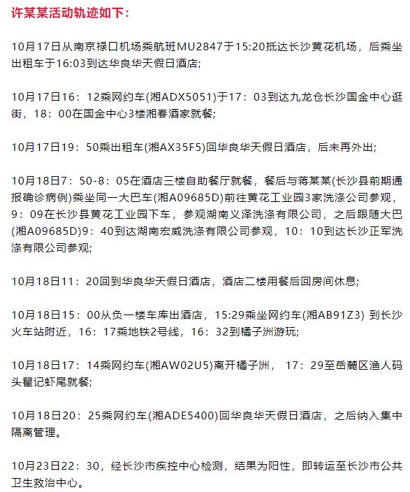 阳性检测者2:许某某,为浙江省湖州人,来长沙参加由江苏某企业举办的智能洗涤观摩活动。系长沙县前期通报确诊病例蒋某某的密切接触者,10月18日晚已由长沙县定点集中隔离管理,18-22日连续5天每日核酸检测结果均为阴性。23日检出阳性,现已转运至长沙市公共卫生救治中心。