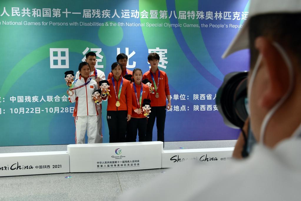 伴着欢快的颁奖乐曲,残奥会盲人短跑冠军、本届全国残特奥会开幕式火炬手周国华与领跑员一同走到领奖台。几米外的摄影区人头攒动,一阵快门声过后,记者们在交谈中离场,只剩下一个人在低头调整相机。