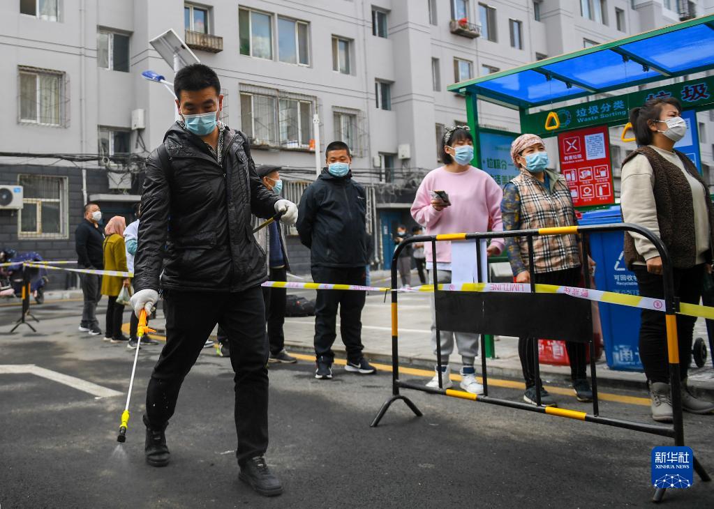 10月24日,在呼和浩特市回民区宽巷子社区设立的临时核酸检测点,工作人员进行环境消杀。