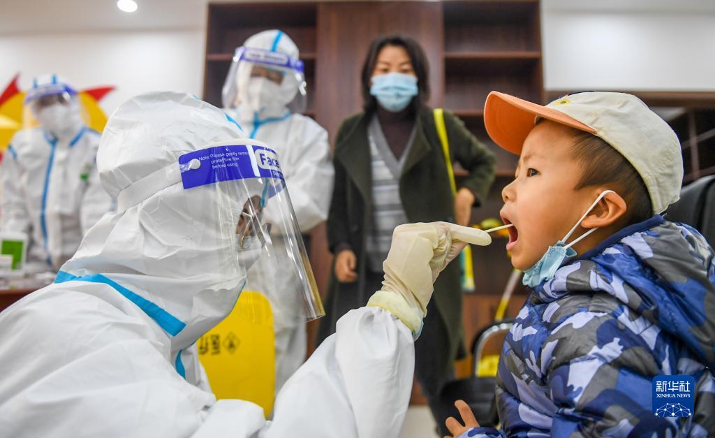 10月24日,在呼和浩特市赛罕区金隅社区设立的临时核酸检测点,小朋友接受核酸采样。