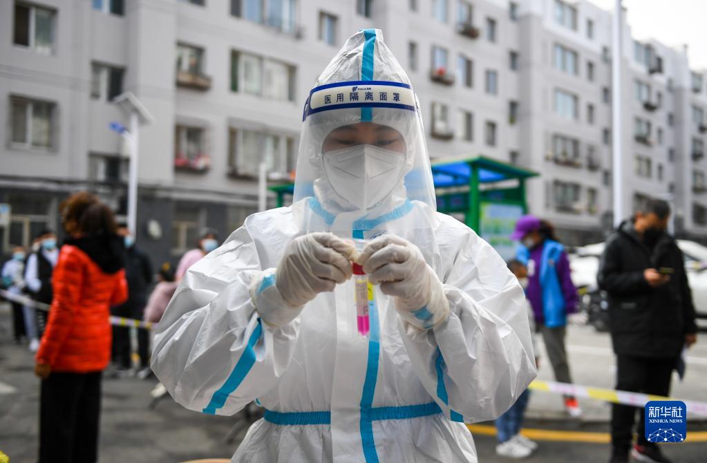 10月24日,在呼和浩特市回民区宽巷子社区设立的临时核酸检测点,工作人员在包装采样试管。
