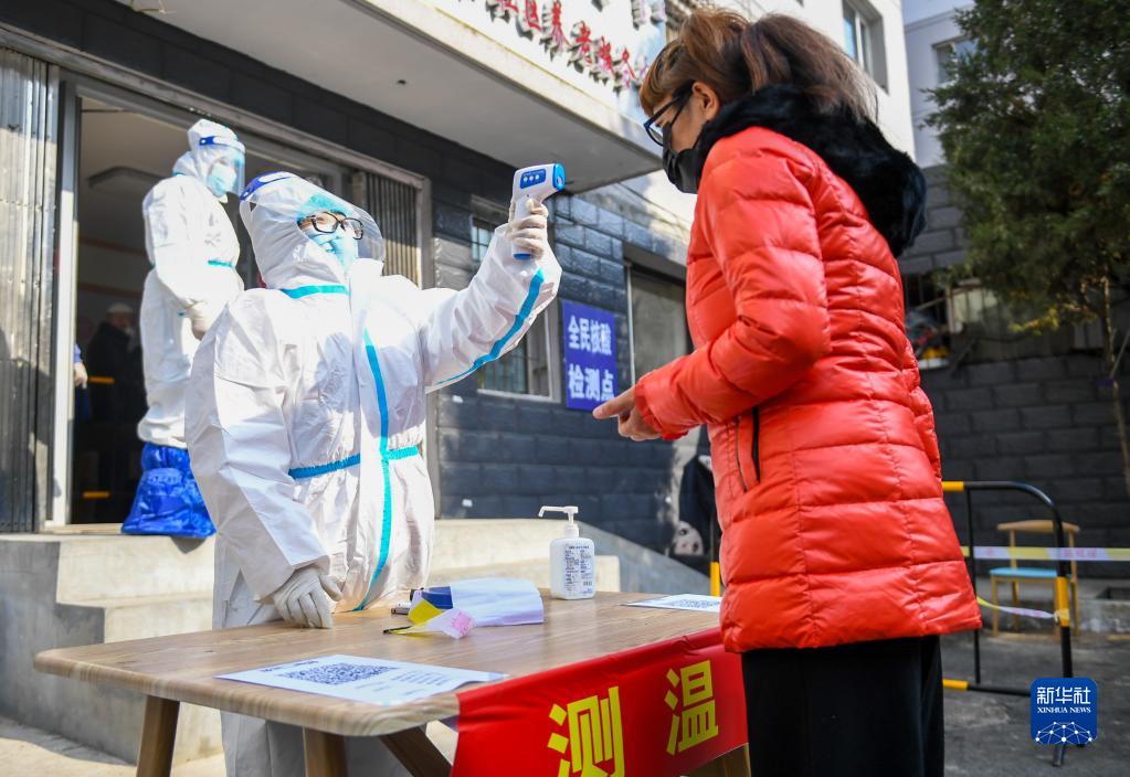 10月24日,在呼和浩特市回民区宽巷子社区设立的临时核酸检测点,工作人员为进入检测点的居民测量体温。