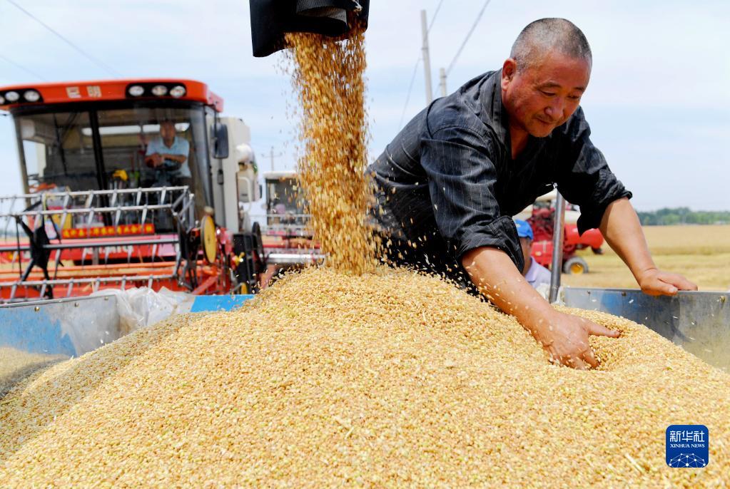 6月13日,河北省衡水市阜城县崔家庙镇前砖门村农民在麦田收获小麦。新华社记者 朱旭东 摄
